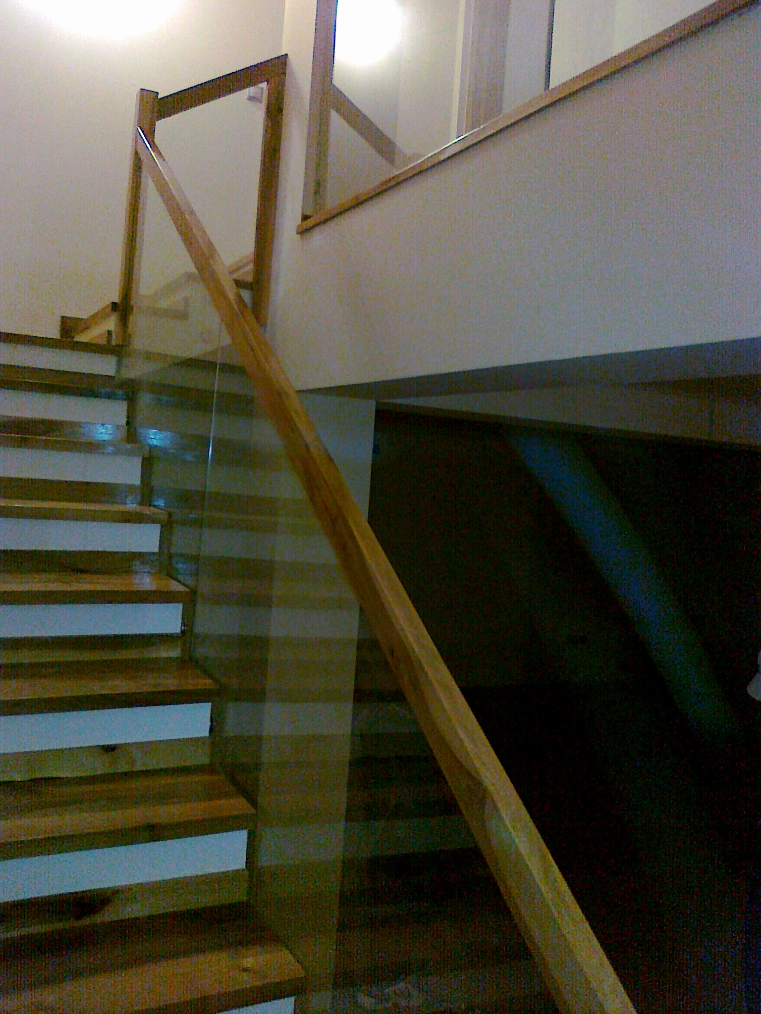 Balustradă din sticlă securizată fixată cu conectori de balustradă din inox, mână curentă din lemn masiv
